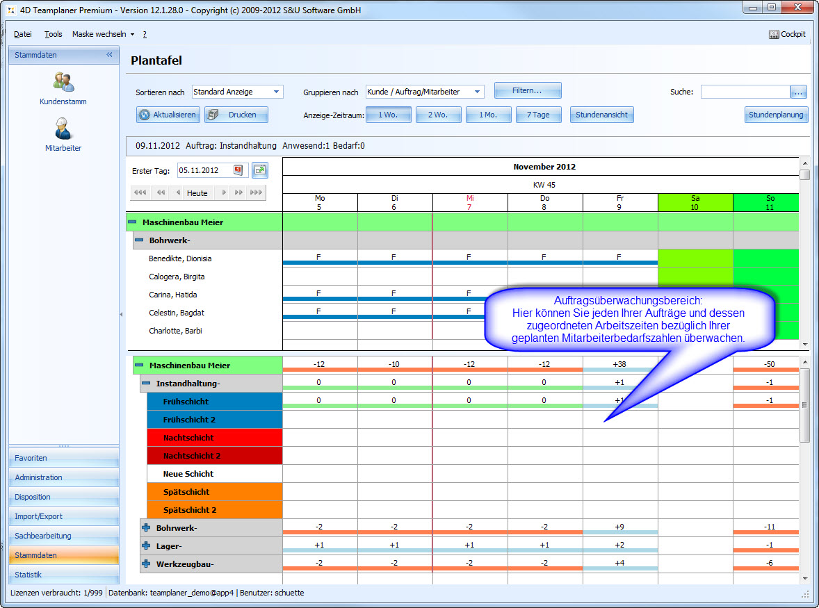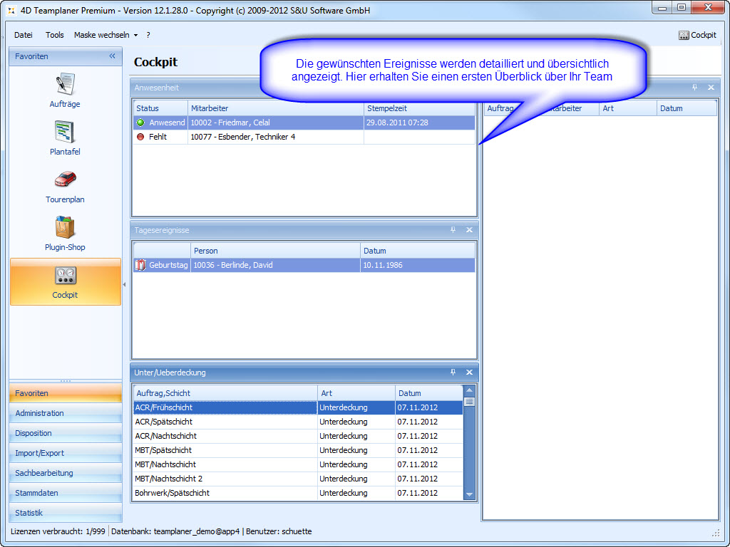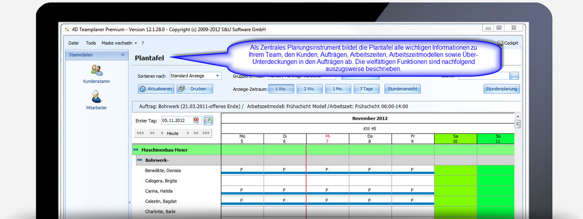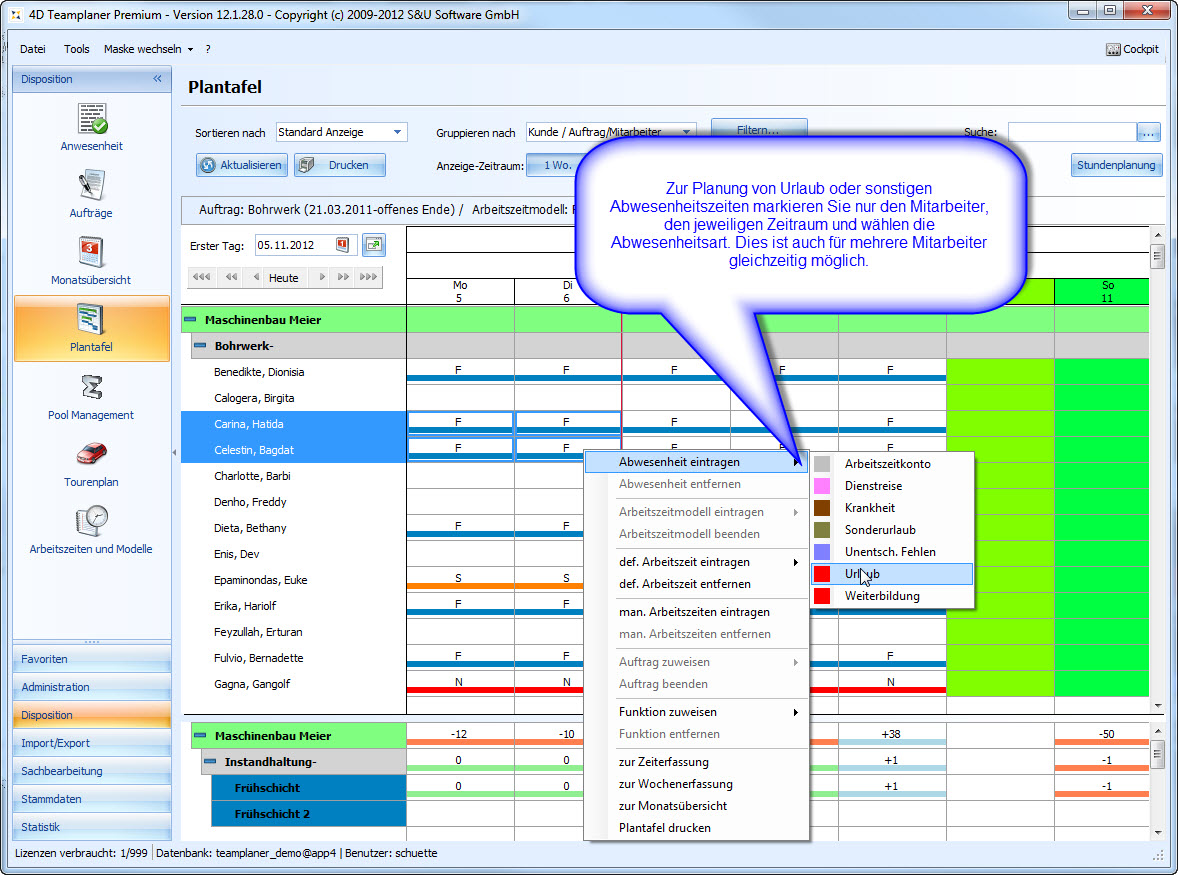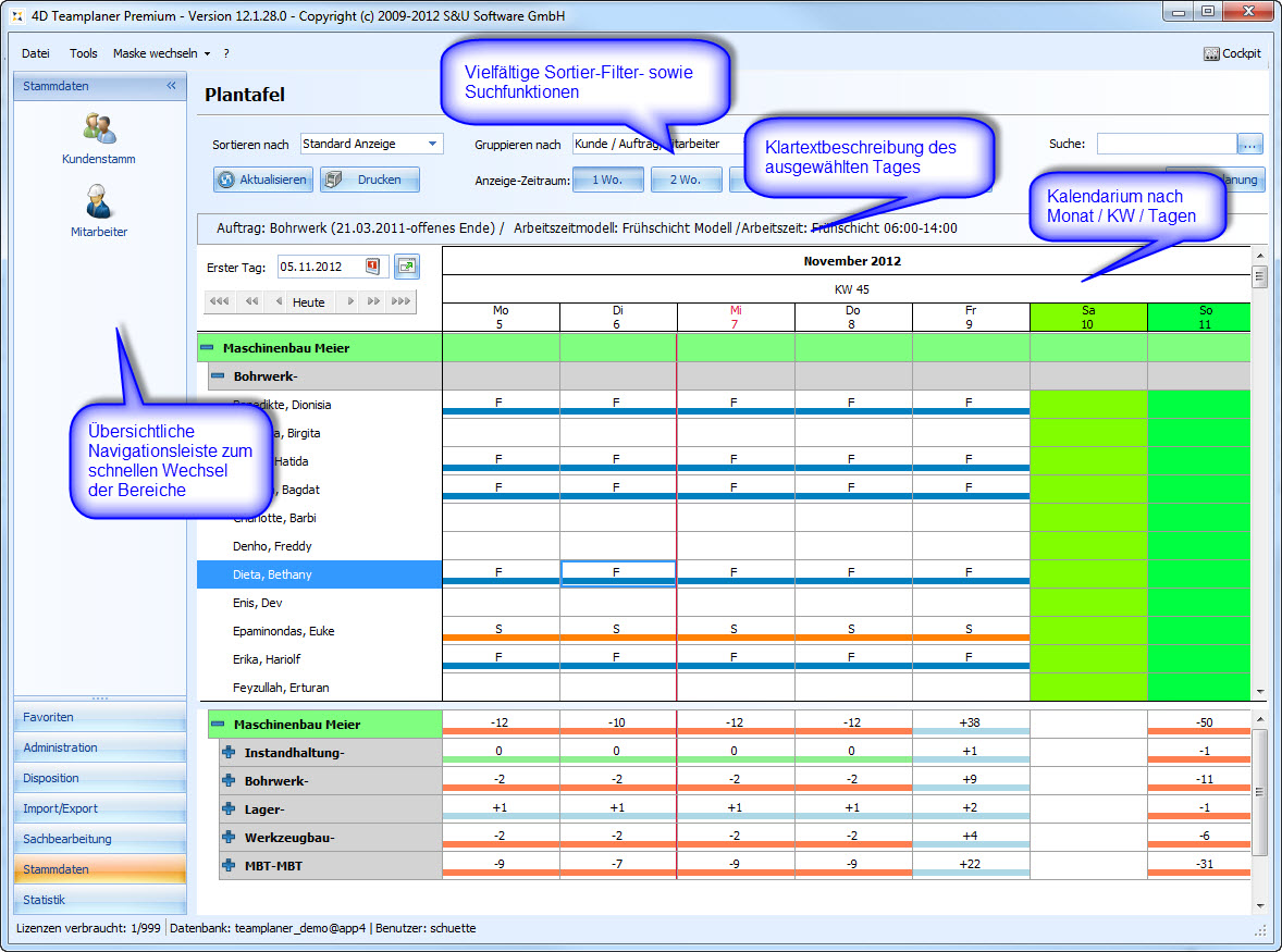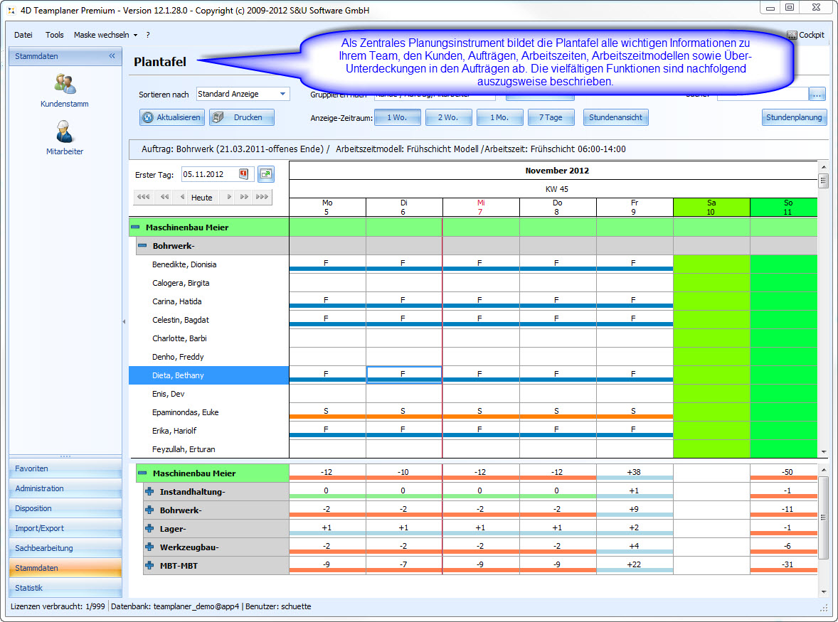 Die Plantafel ist unser zentrales Planungs- und Management-Werkzeug für die Urlaubsplanung, Schichtplanung, Einsatzplanung und Personalplanung. Egal ob Industrie-Betrieb, Handwerk, Feuerwehr, Pflegedienst oder Catering-Service: Wenn Sie Personal zu planen haben, Urlaub verwalten wollen oder Schichten disponieren, ist der 4D Teamplaner das ideale Werkzeug für Sie.